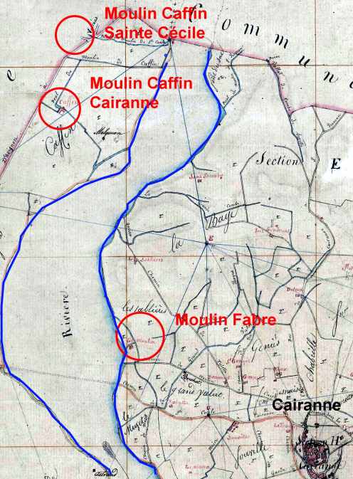 Localisation des deux moulins "Caffin" et du moulin Fabre.