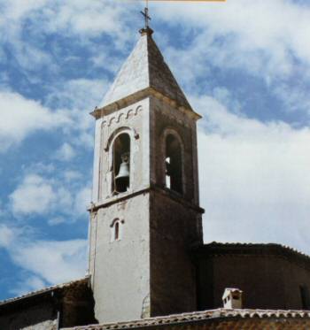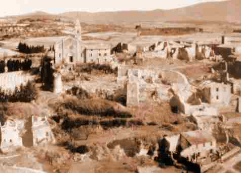 A droite l’église reconstruite au XIXe siècle. Sur la gauche une aire de pique-nique a remplacé un quartier de vielles maisons en ruines qui ont été démolies,