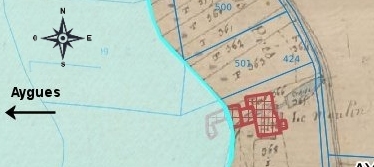 Superposition des cadastres de 1830 et moderne. En 1830, le lit de l’Aygues est déjà proche du moulin. En rouge le gîte des peupliers aujourd’hui qui aurait été partiellement sous l’eau.